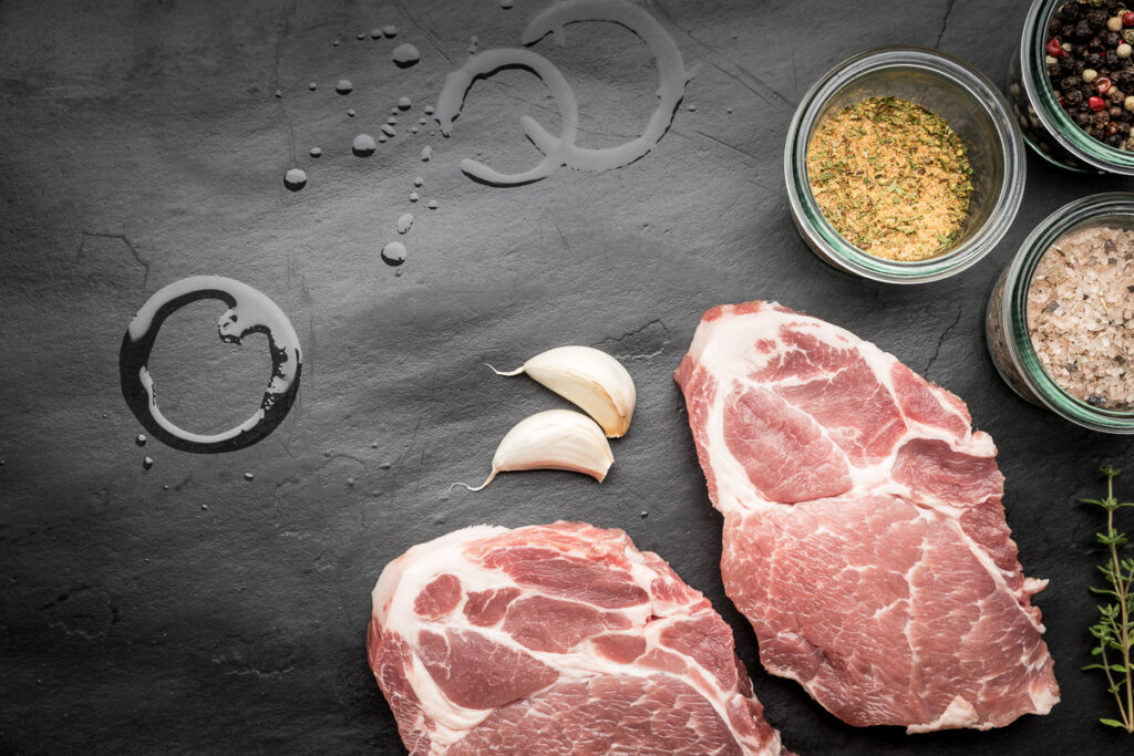 Gutes Schweinefleisch ist hellrosa mit leichtem Glanz. Ein großes Qualitätsmerkmal sind die Fetteinschlüsse und die Fettabdeckung, da diese beim Braten vor dem Austrocknen schützt.